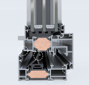 Σε όλα τα προφίλ του συστήματος εφαρμόζονται πολυαμίδια πλάτους 32mm με υαλοενίσχυση 25%, προσφέροντας υψηλά επίπεδα θερμομόνωσης και εξαιρετική στατική αντοχή.