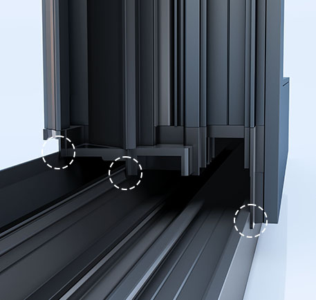 Για το πιο αδύναμο σημείο της δίφυλλης κατασκευής, χρησιμοποιούμε μόνο ελαστικές τάπες για το μπινί. Xάρη στην ελαστικότητα του υλικού και την ευέλικτη σχεδίαση, τα κενά εξαφανίζονται και το εξάρτημα της ελαστικής τάπας σφραγίζει απόλυτα στην επιφάνεια του αλουμινίου, καθιστώντας το κούφωμα αδιαπέραστο.